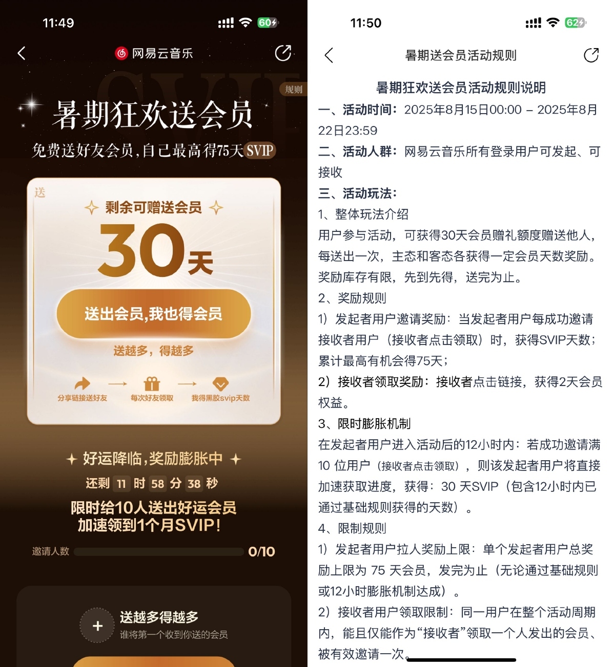 跳转到网易云音乐APP->可免费送15个2天会员,同时自己也会获得最高75天会员->累计送给10个人额外领1个月会员